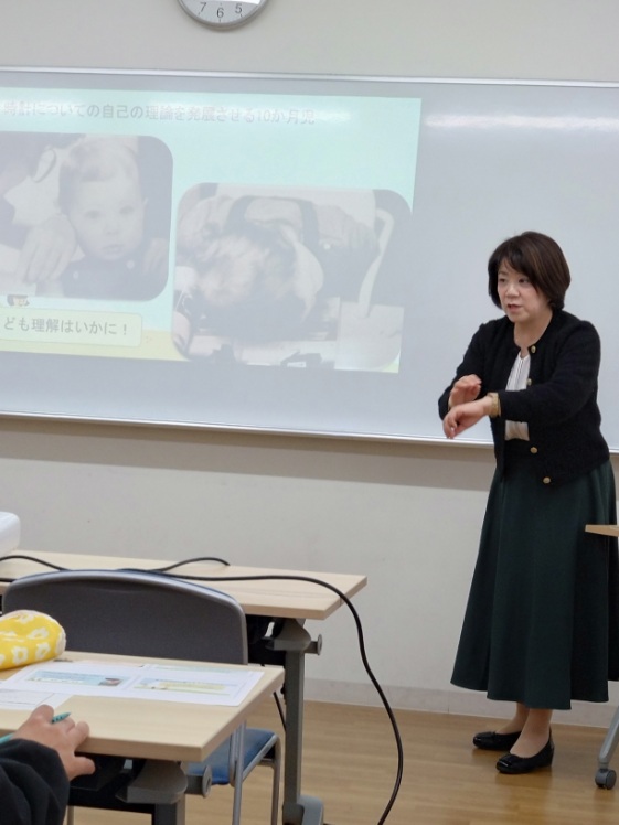 前半は動画を見たり手遊びを交えながら、こどもの行動には理由があることを学びました。「子どもに寄り添い、子どもの心の声に耳を傾け、子どもの世界にどっぷりとつかり、一緒に楽しみながら子どもの世界を共有していくことが保育の出発点である」との言葉が印象的でした。